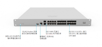 Cisco Meraki MX84、M100、MX250 和 MX450 型號(hào)支持熱插拔光模 塊,后者用于在配線柜和聚合交換機(jī)之間建立高速骨干連接。